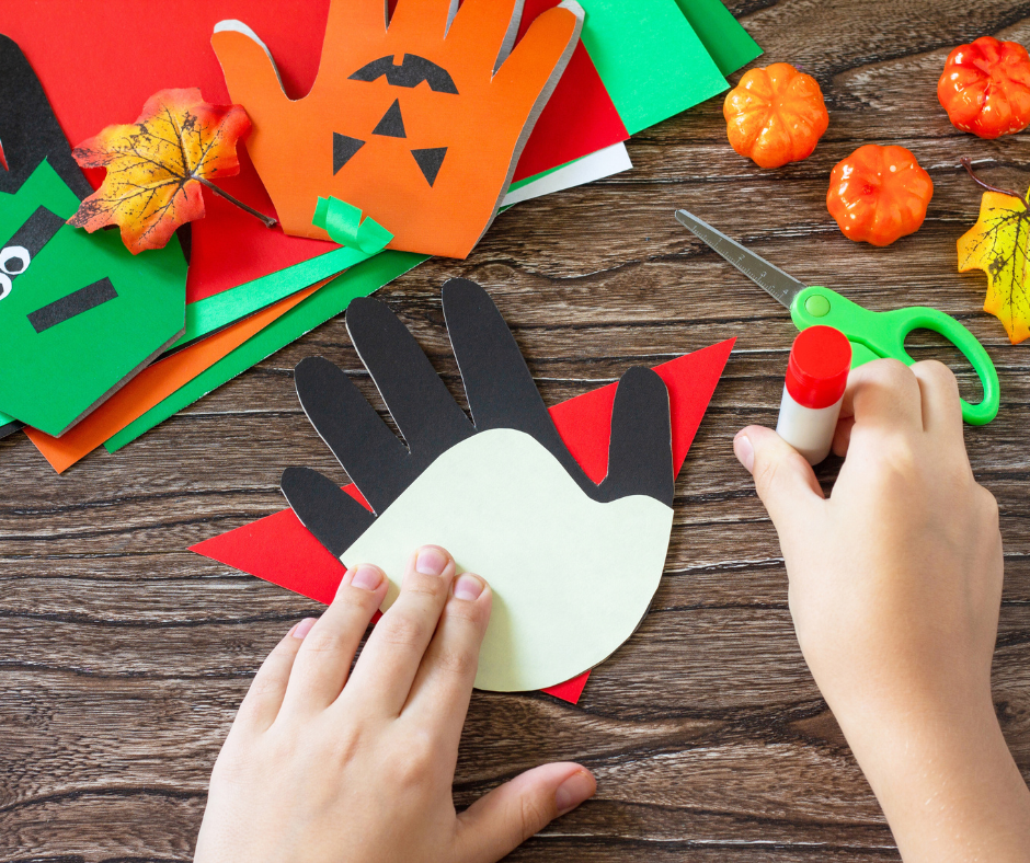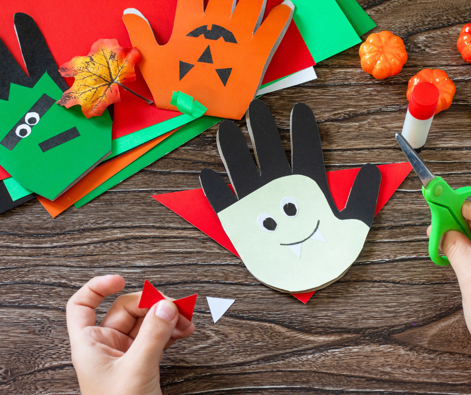 - Cut out the handprint, then let your child attach Dracula’s spooky face using glue. Don’t forget the sharp fangs and bowtie!