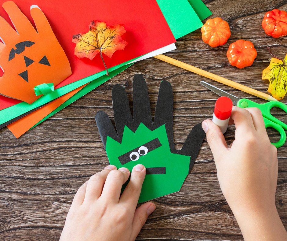- Select green construction paper for Frankenstein’s face and black paper for the handprint.