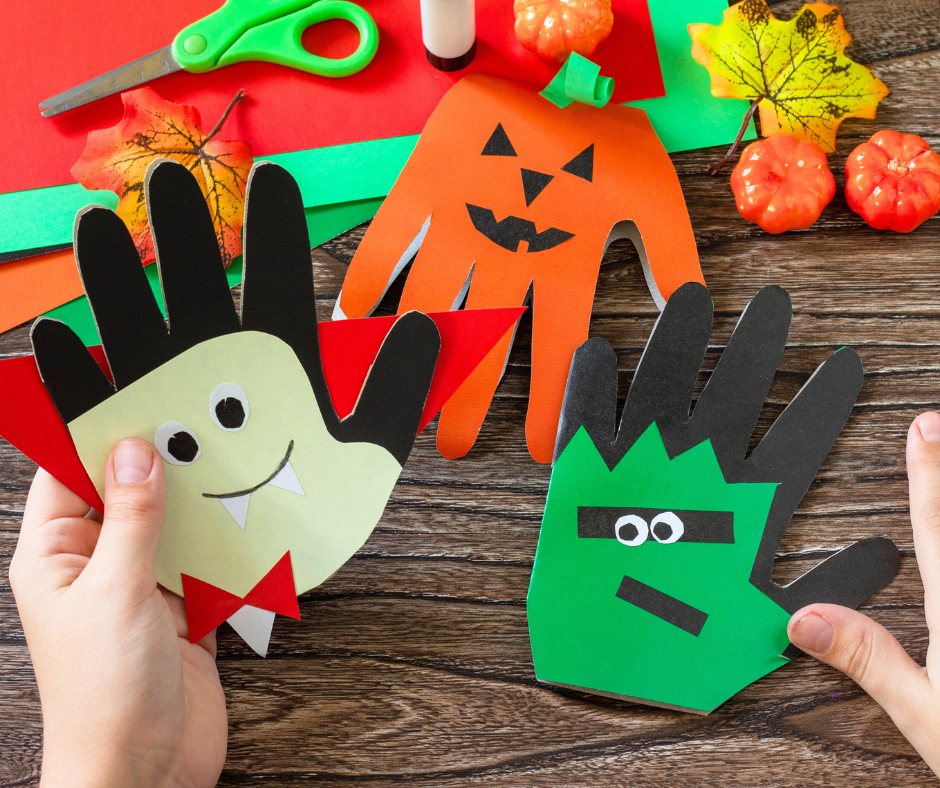 Get creative with your little monsters and make your very own Jack O’Lantern, Frankenstein, and Dracula handprint characters.