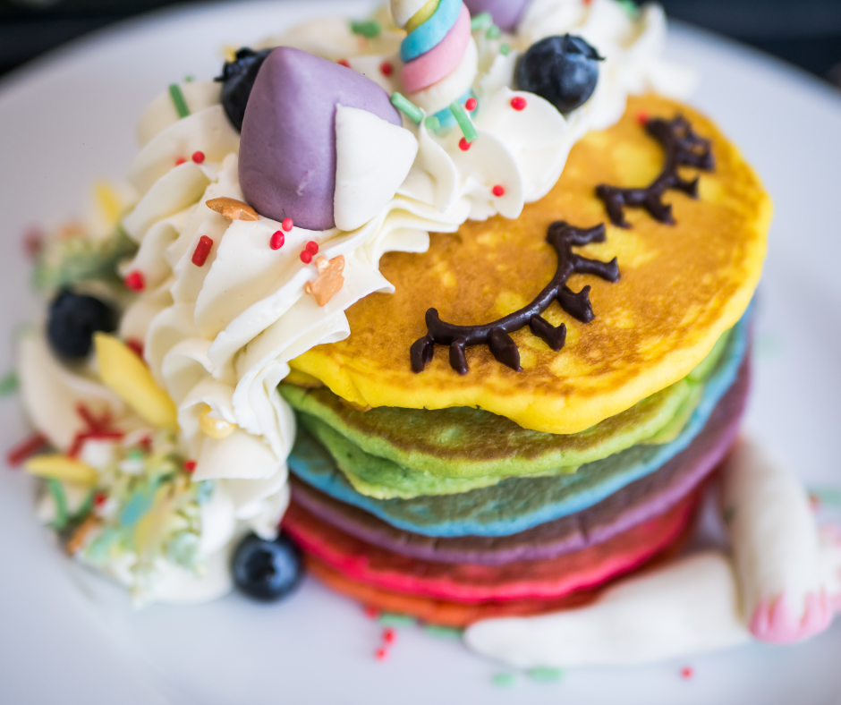 - Whip up some clouds of whipped cream to shape your unicorn with generous dollops on top of each pancake stack. You can use marshmallows for the horn and don’t forget to add frosting eyes. Top with sprinkles and fresh blueberries. This adds a delightful unicorn design and a touch of magic to your Rainbow Pancakes.